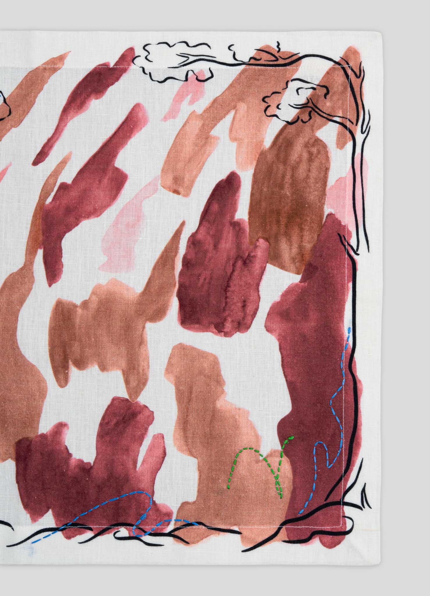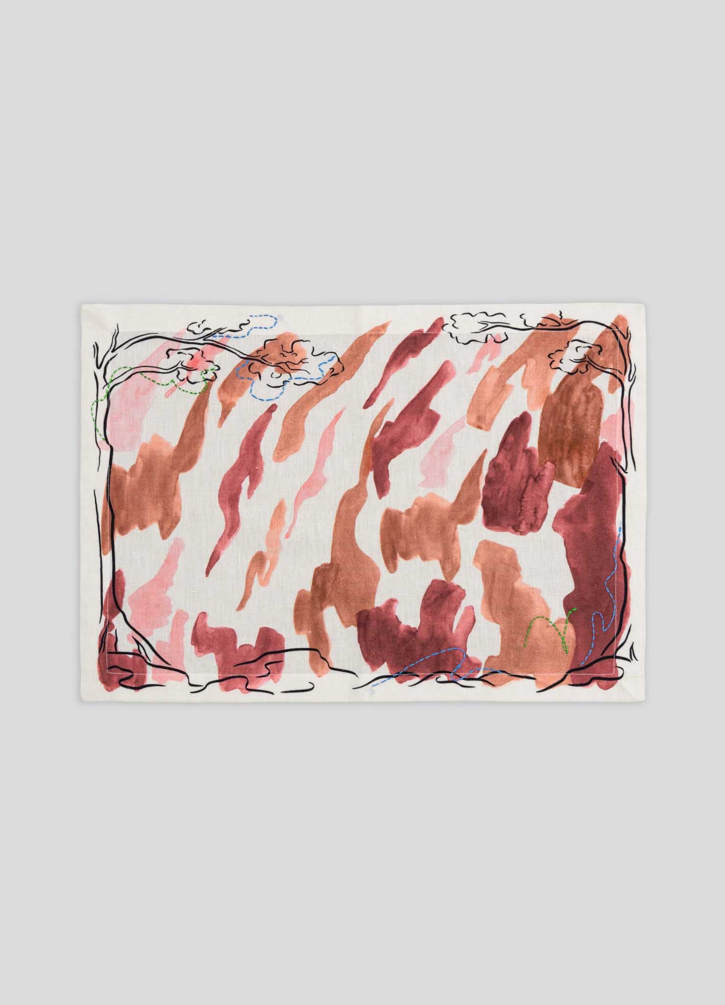 Printed & hand embroidered placemat in cotton linen. Handmade in India.