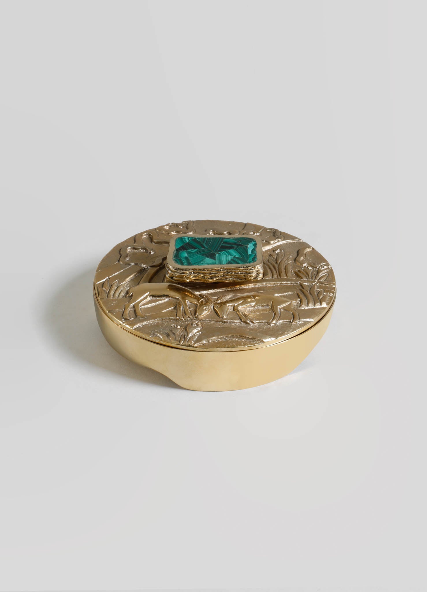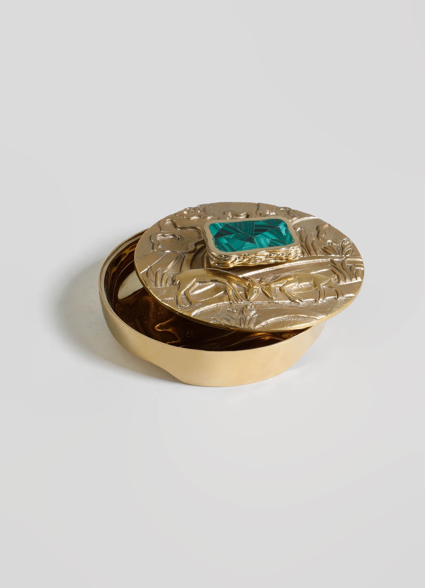 Trinket box in brass with semi precious inserts. Handmade in India.
