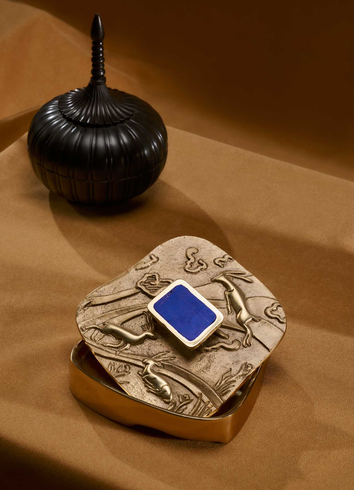 Trinket box in brass with semi precious inserts. Handmade in India.