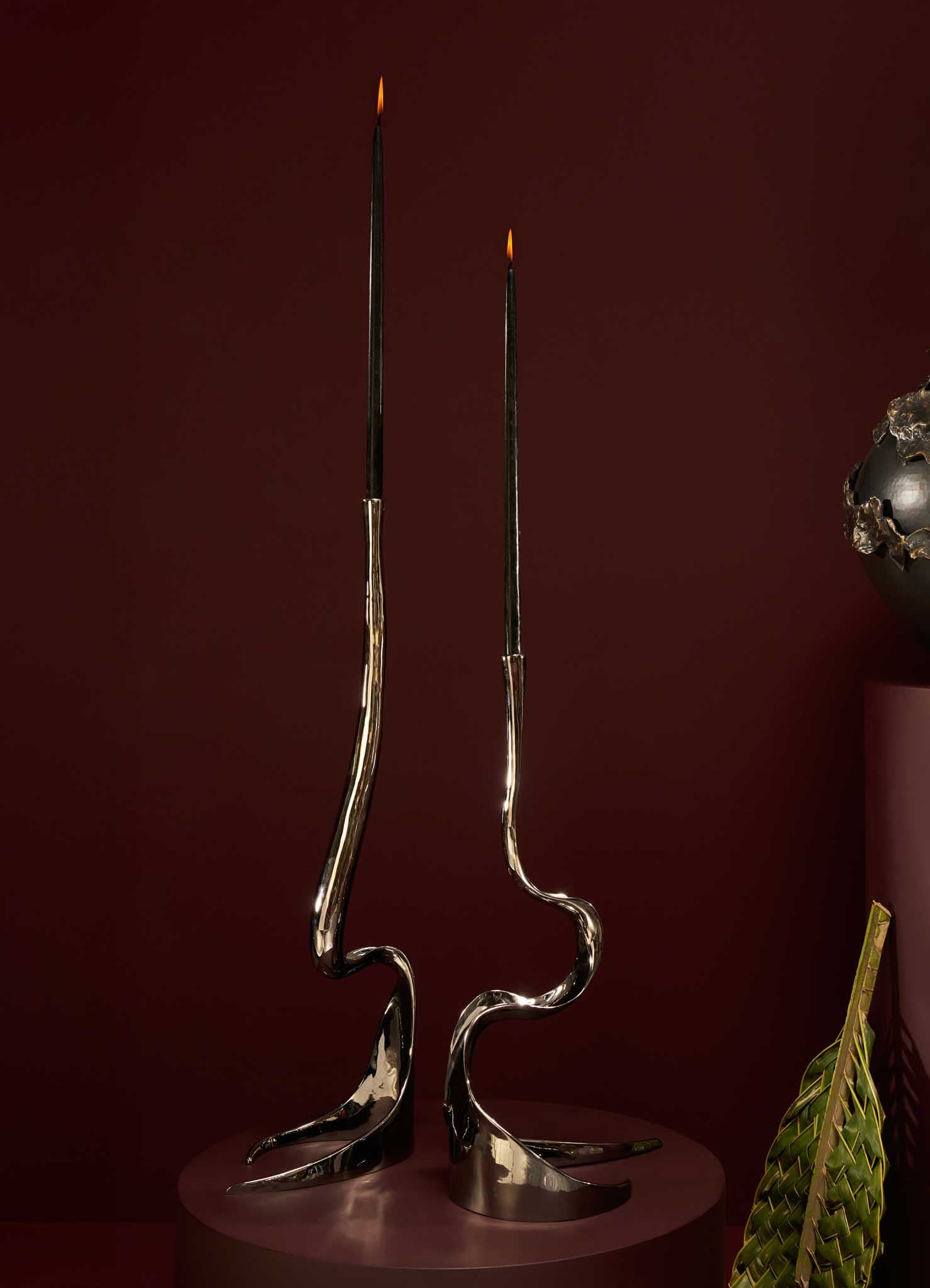 The serpent slithers through many of our stories, curling and rising with myth and memory. Inspired by centuries of storytelling, this sculptural candlestand draws from the lithe form of the Naga—the cobra long revered in Indian mythology as a symbol of fertility, protection, and the elemental force of life. Here, it emerges in polished metal—elegant and sinuous, a flicker of movement caught in stillness.