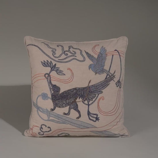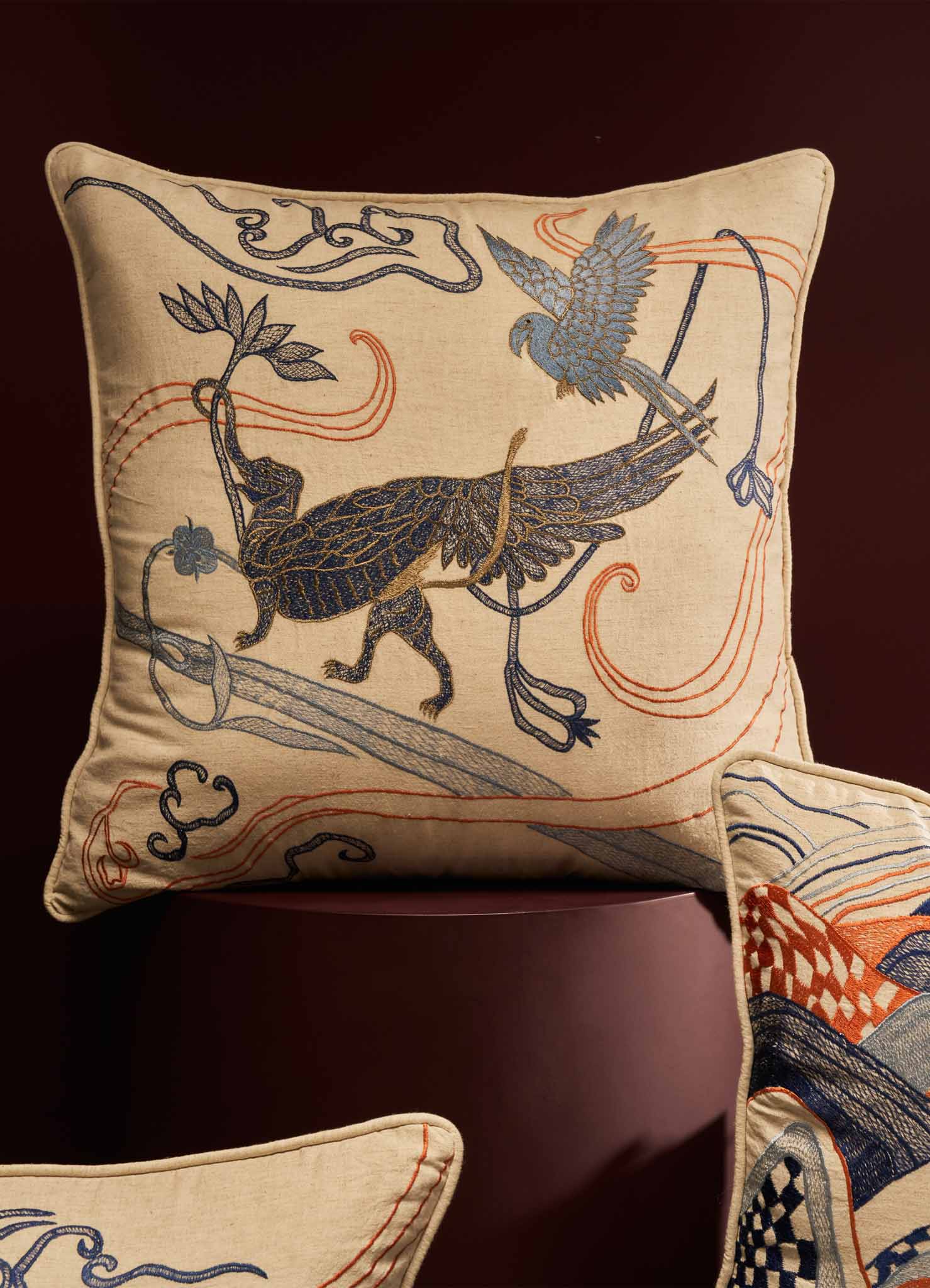Behold the tangible embodiment of a reverie – a whimsical collection of textiles inspired by the 17th-century Rajput manuscript, "The Book of Dreams." These embroidered textiles bring to life symbolic motifs laden with auspicious blessings, from the powerful Gajaraja, Elephant King, and mythical Gajasimha, Elephant Lion, to the auspicious tree full of winged parrots and majestic Blackbuck antelope. Each piece carries an innate promise of good fortune, inviting the user to partake in a journey through the realm of dreams and ancient wisdom.