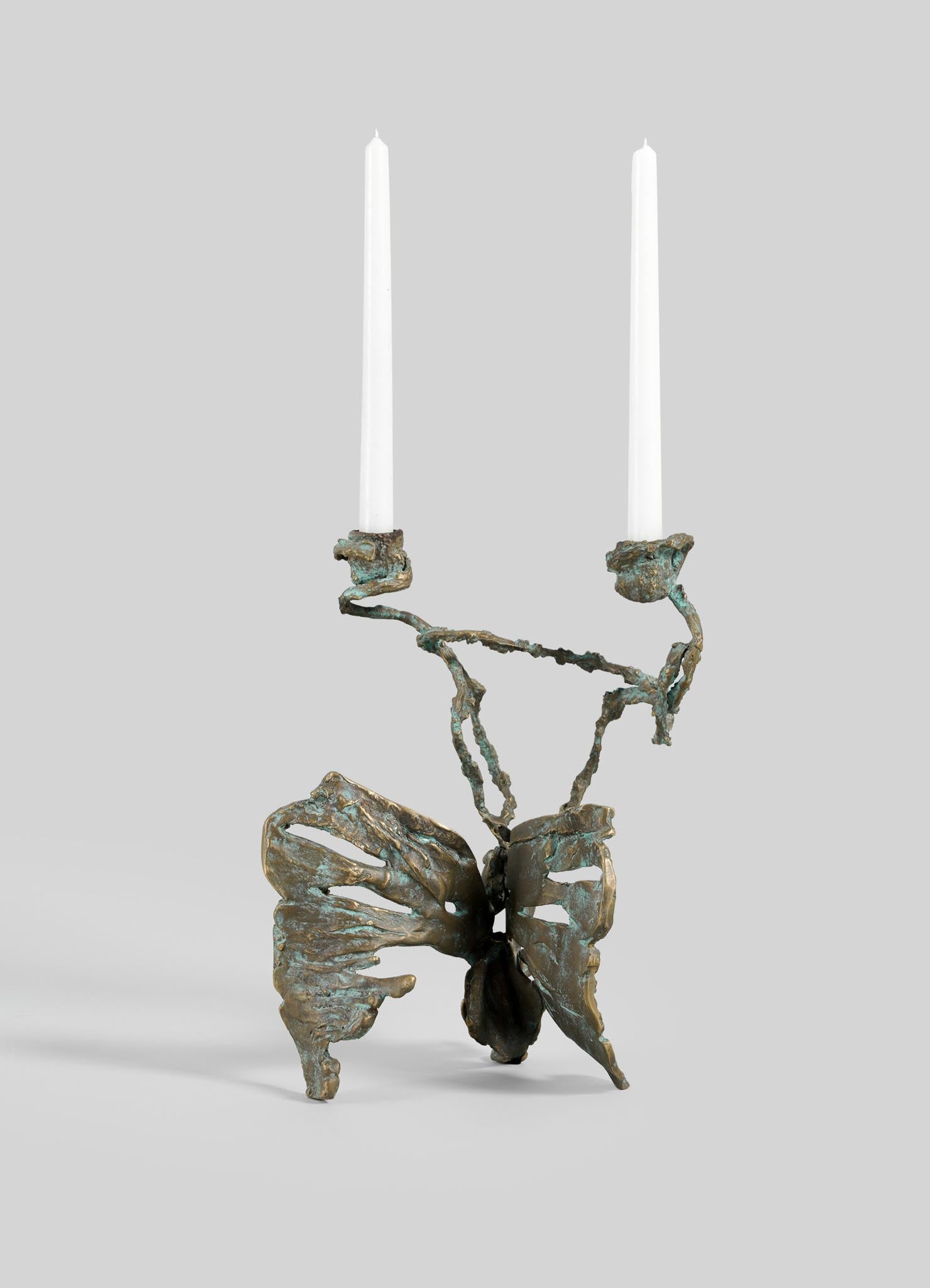 A metamorphosis from inspiration to sculptural form, the ‘Butterfly Garden’ twists and rises in rhythmic movement, much like a flight of butterflies lifting from jasmine flowers in an Indian garden. A trace of movement held in time, an ode to their tender choreography—wings, movement, and flight cast in brass with a soft verdigris finish.