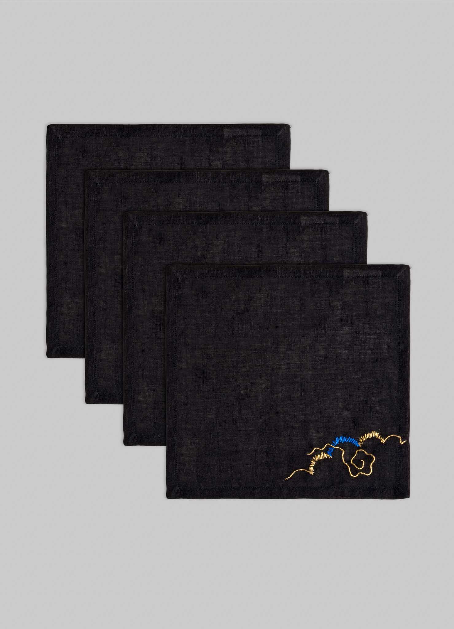 Hand embroidered cocktail napkins in cotton linen. Handmade in India.