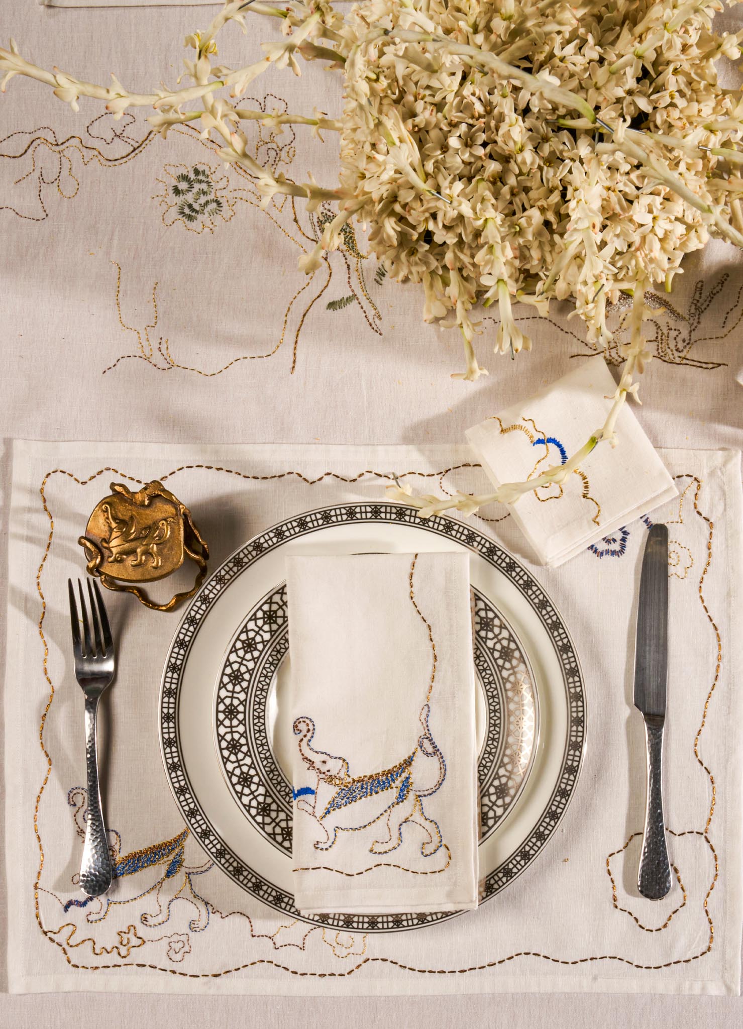 Gajasimha Hand Embroidered White & Gold Placemat