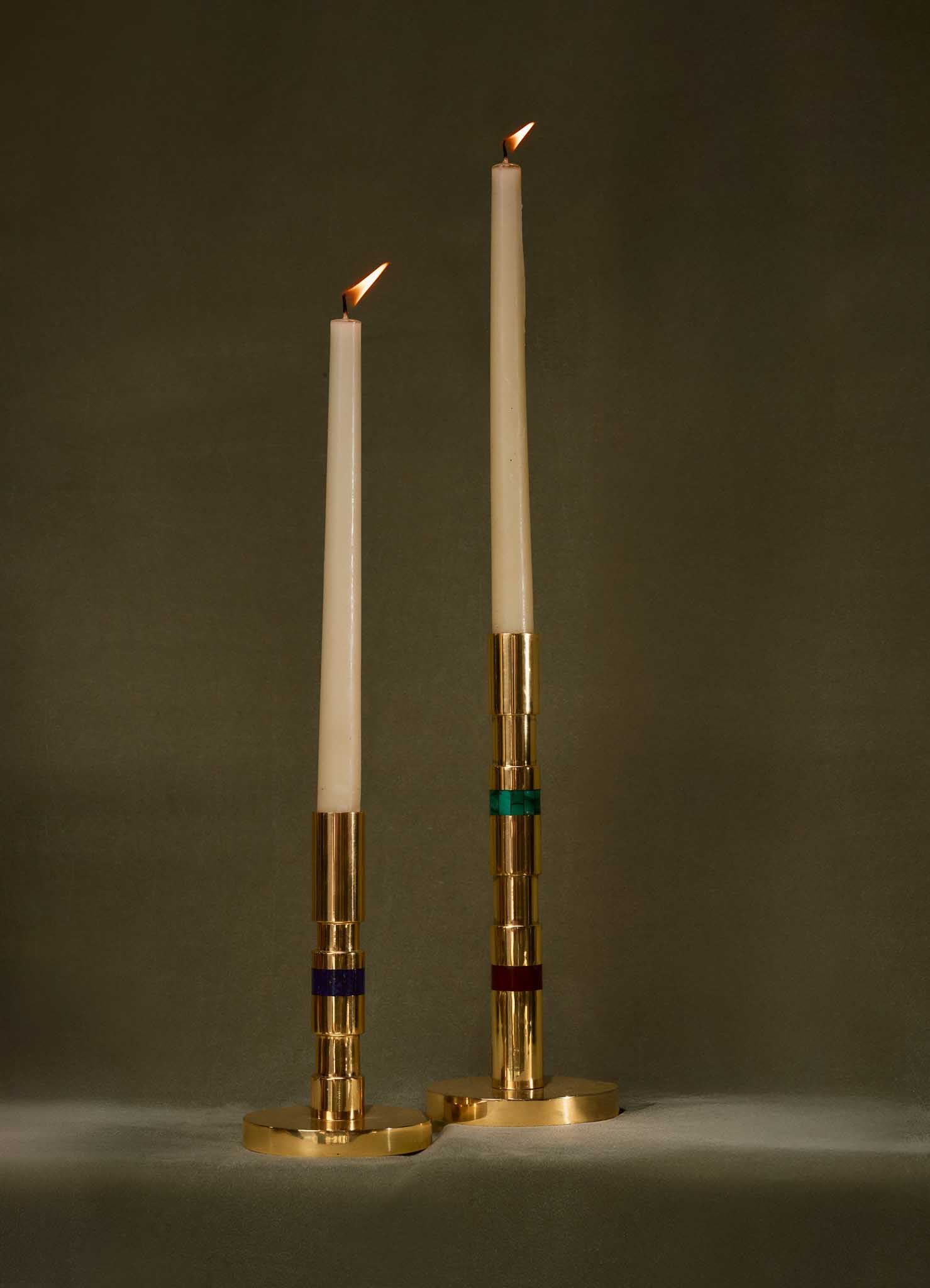 Candle Stand in brass with semi precious inserts. Handmade in India.