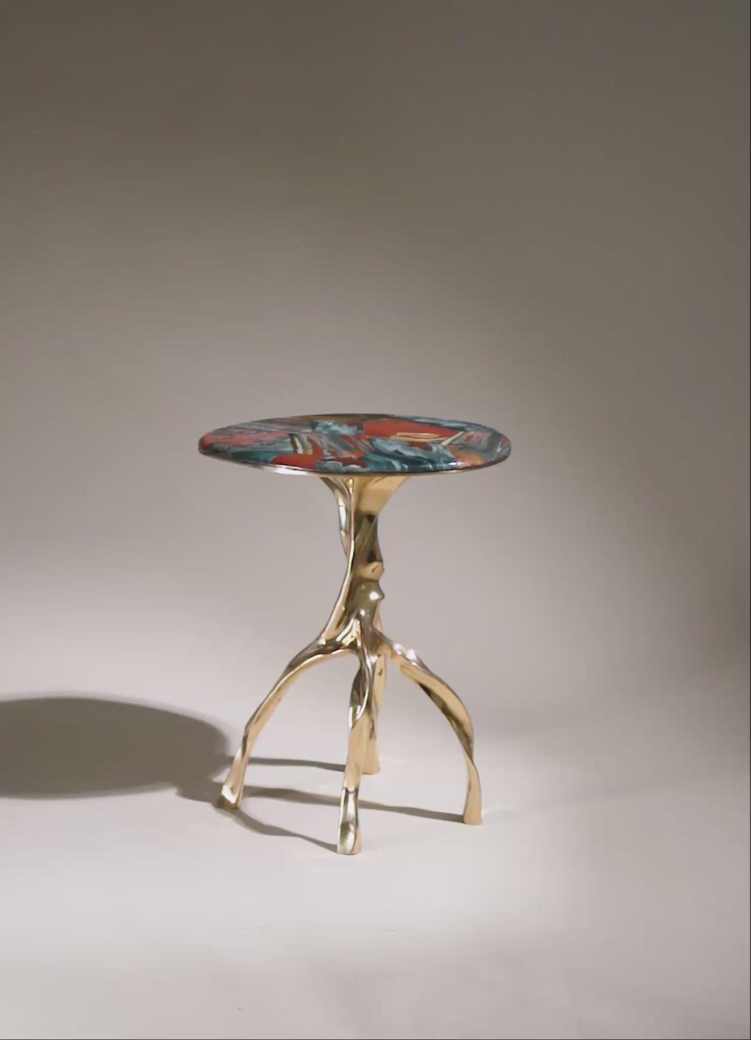 Side Table in brass with semi precious overlay top. Handmade in India.