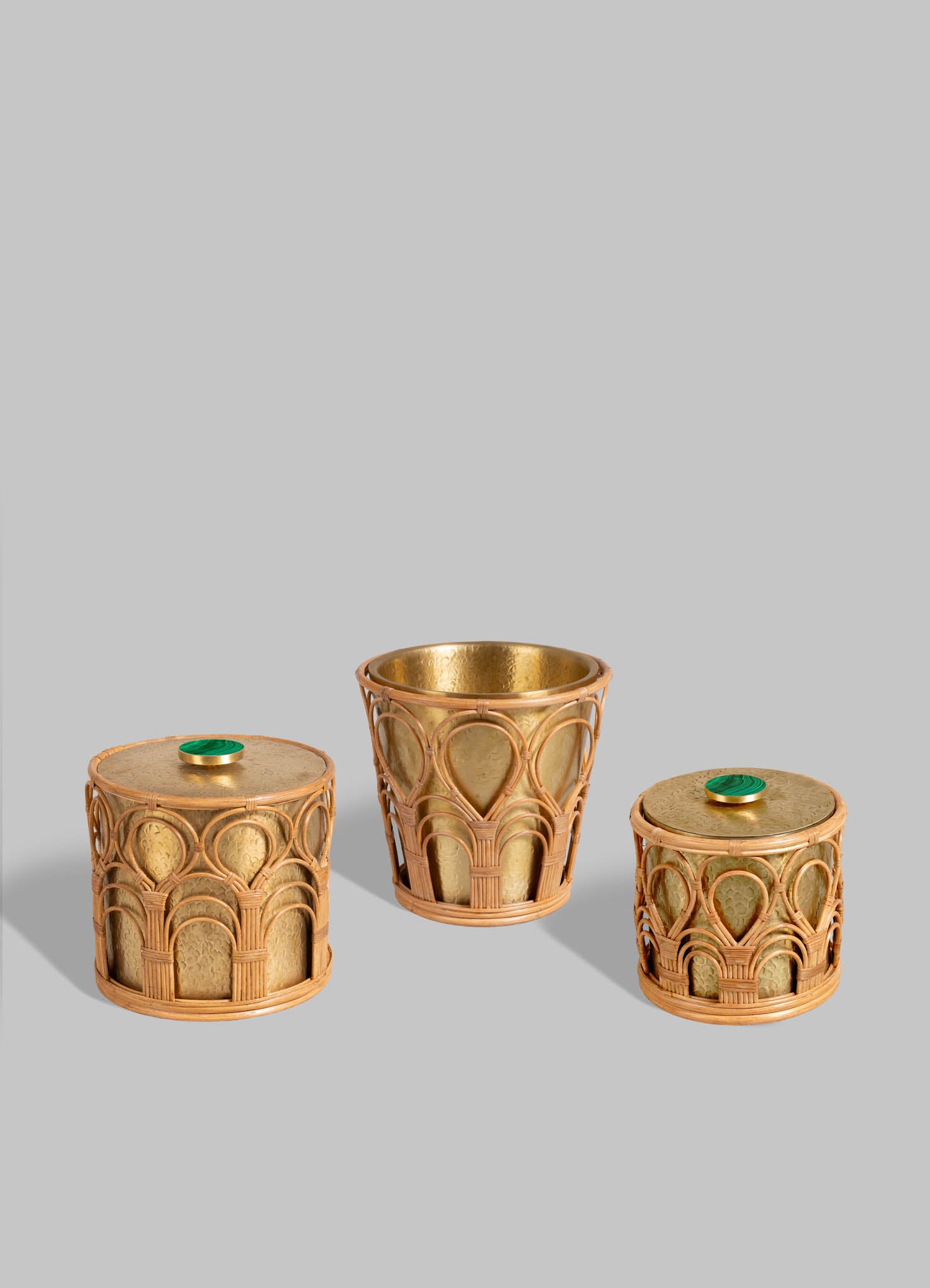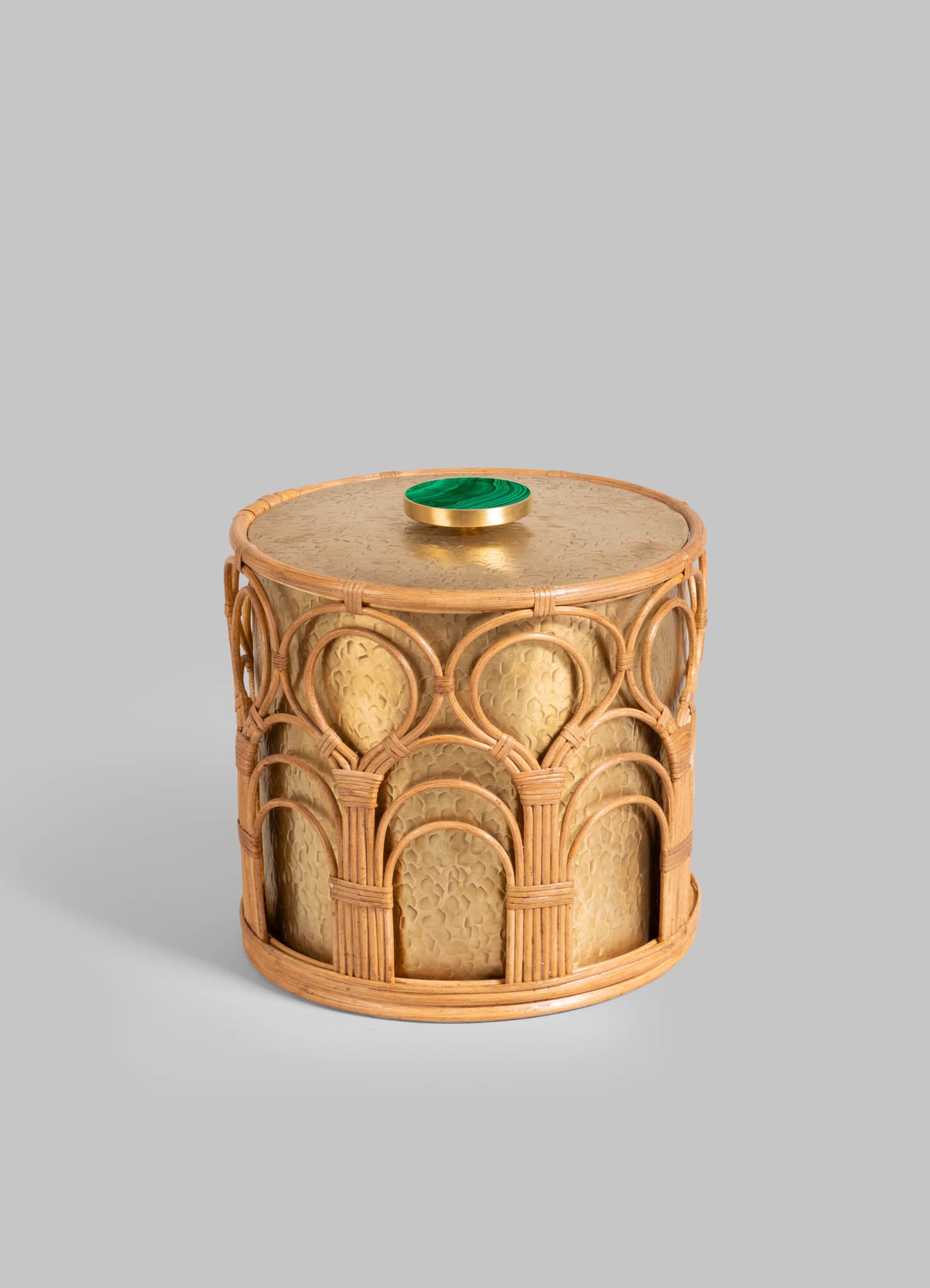 A classic pairing, reimagined. Robust cane becomes latticed second skin to the hand-beaten brass objects in an effortless collaboration. These barware accessories are crafted as perfect accompaniments to your bar or serve as versatile standalone objects for your home.