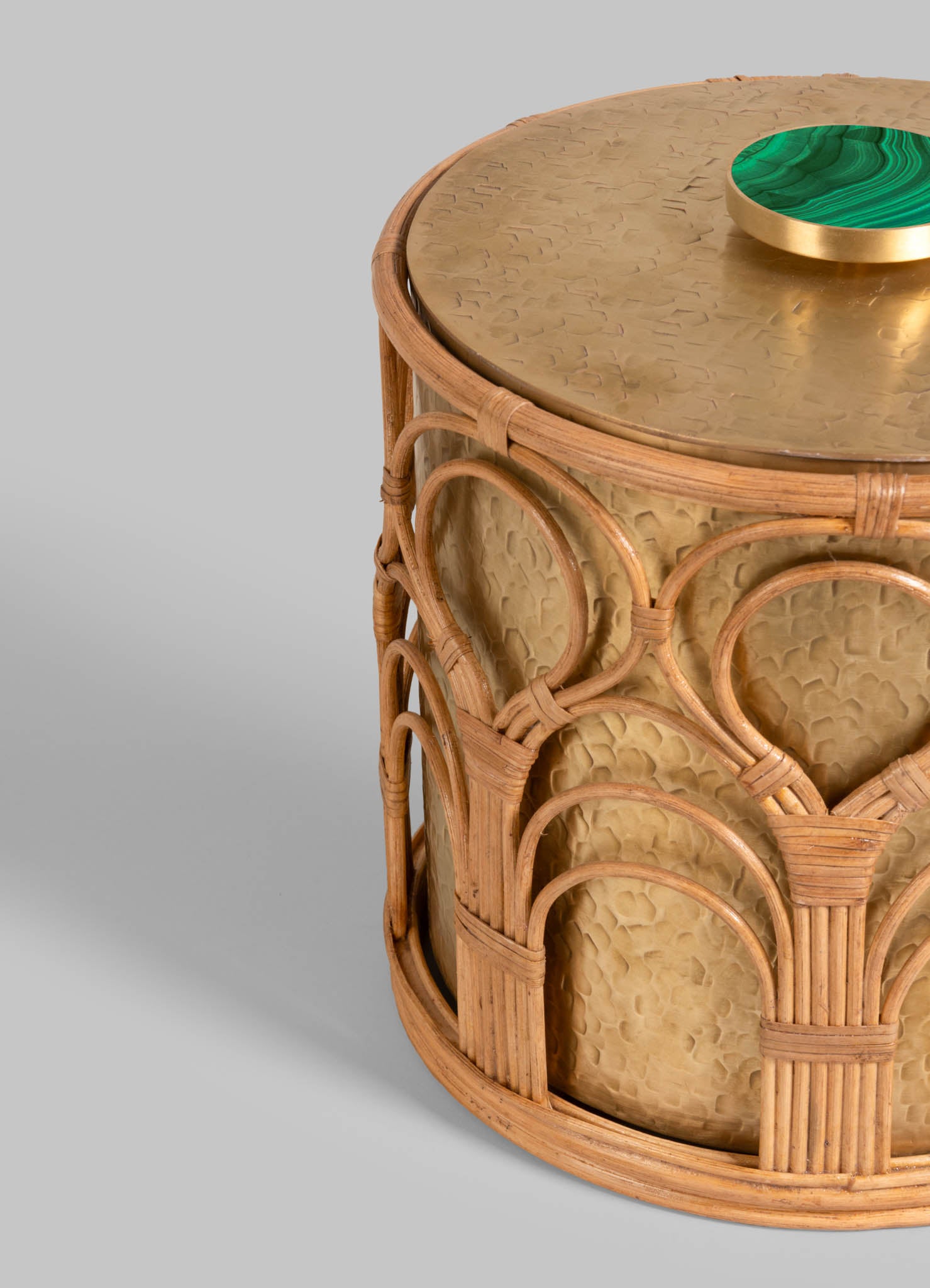 A classic pairing, reimagined. Robust cane becomes latticed second skin to the hand-beaten brass objects in an effortless collaboration. These barware accessories are craf. . . more