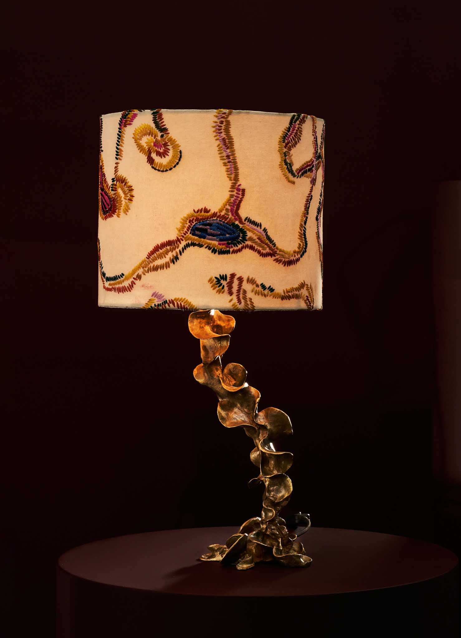 Table Lamp in brass with embroidered lamp shade. Handmade in India