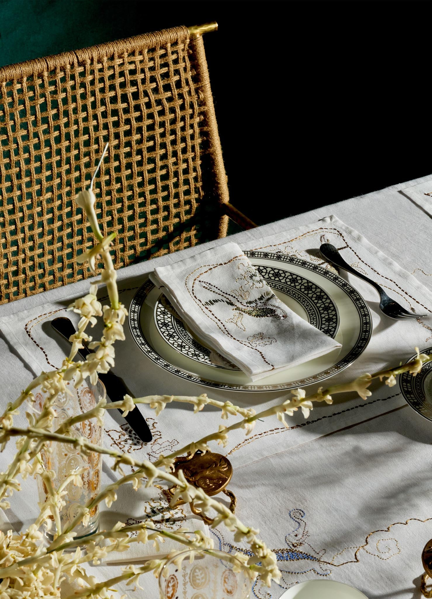 A tree full of parrots is a sign of success in aspirations and future endeavours. According to the 17th century Indian manuscript, “The Book of Dreams”, encountering this avian spectacle in dreams is deemed profoundly fortunate, made more so living amongst the trees of life. Their raucous, throaty squeaks travel far, symbolising blessings and good fortune - qualities we manifested in every hand-embroidered detail of this collection of table linen.