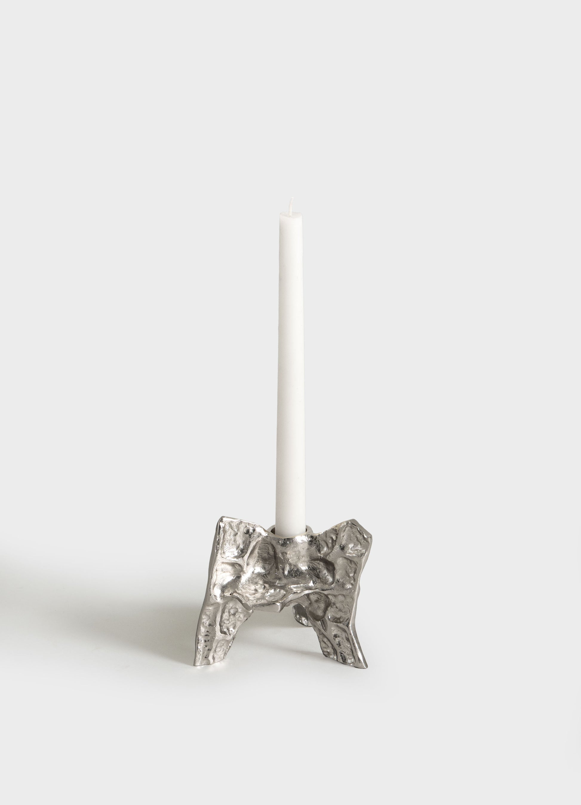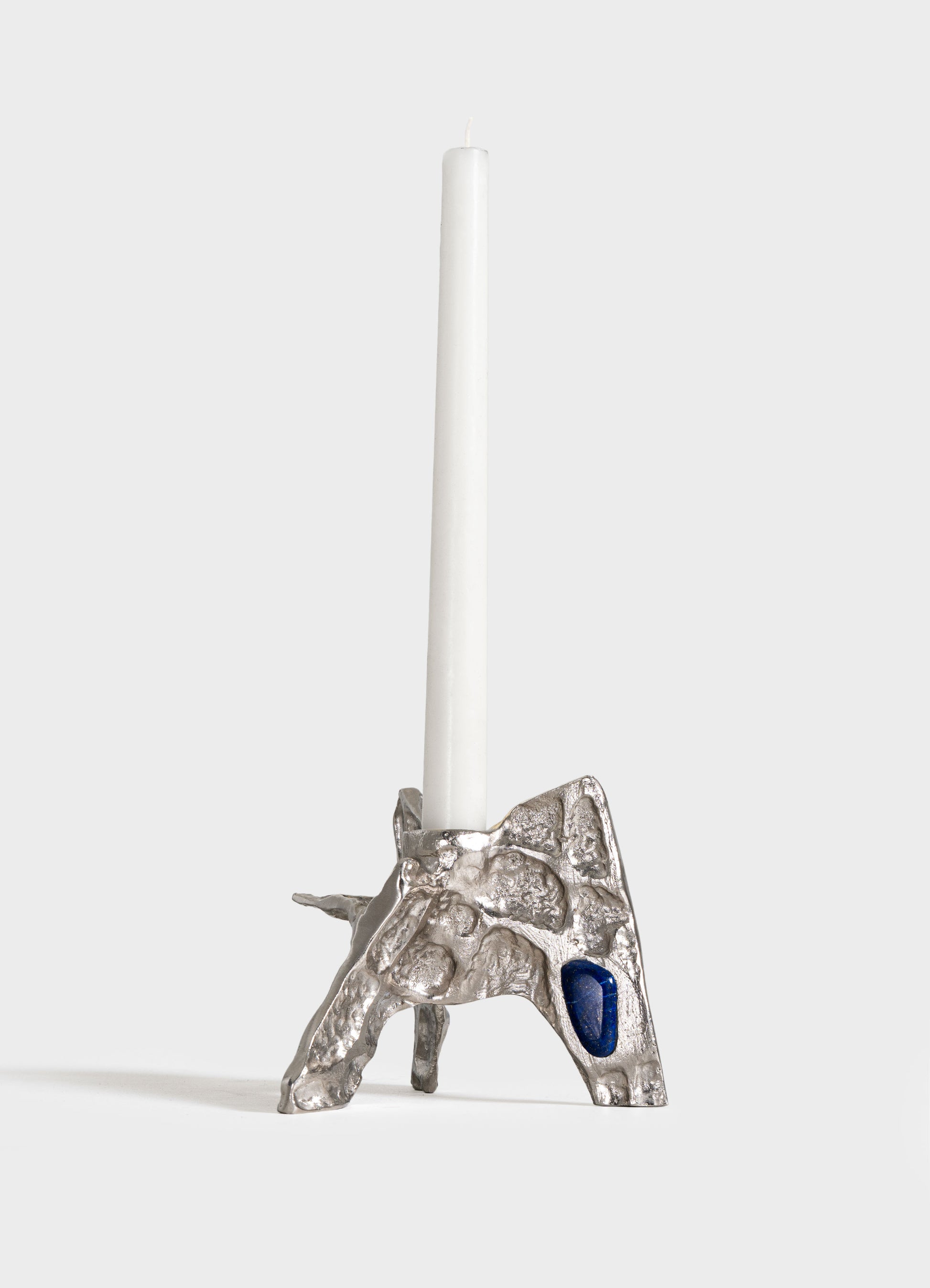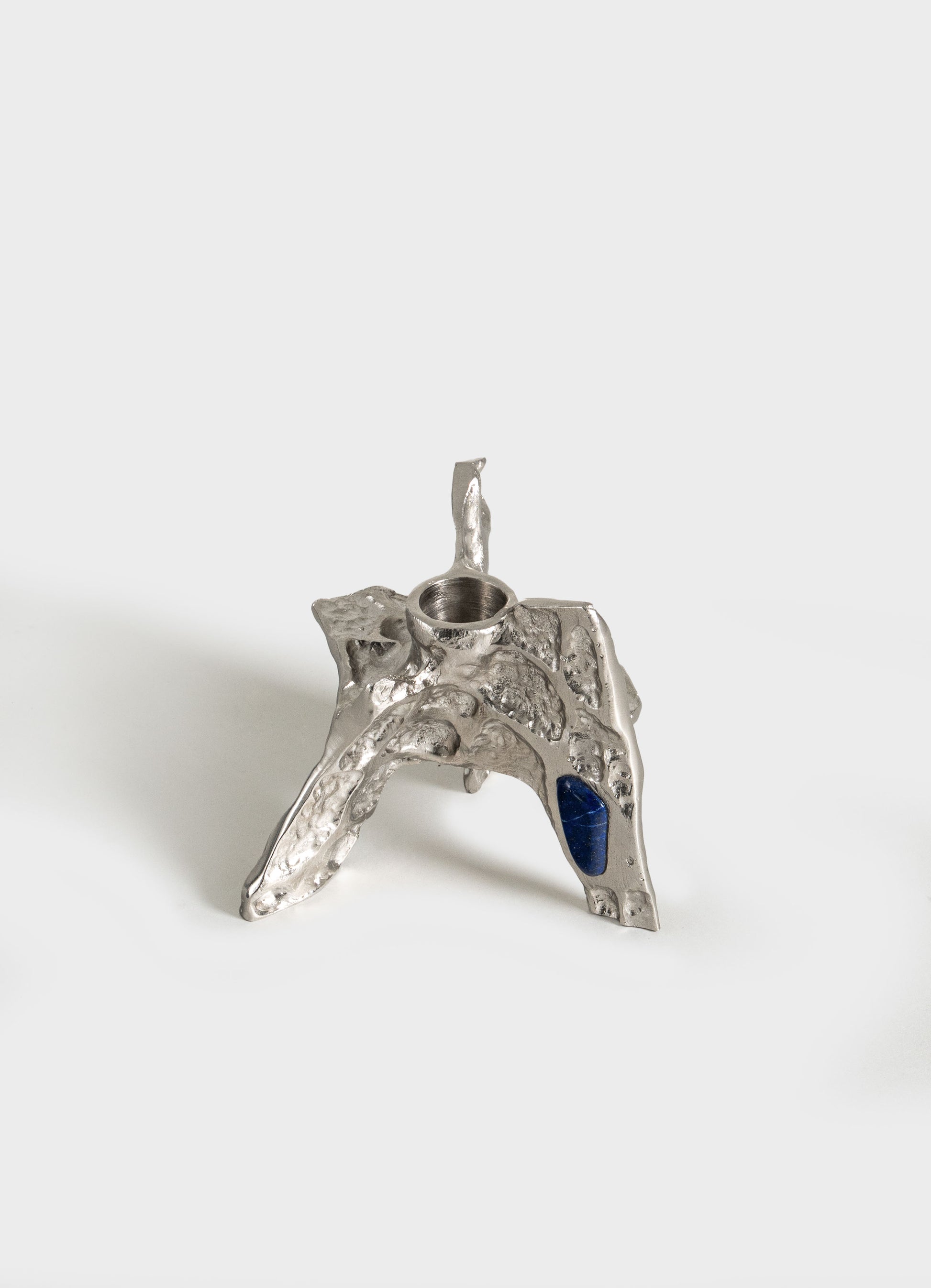 Candle stand in brass and nickel with semi precious inserts. Handmade in India.